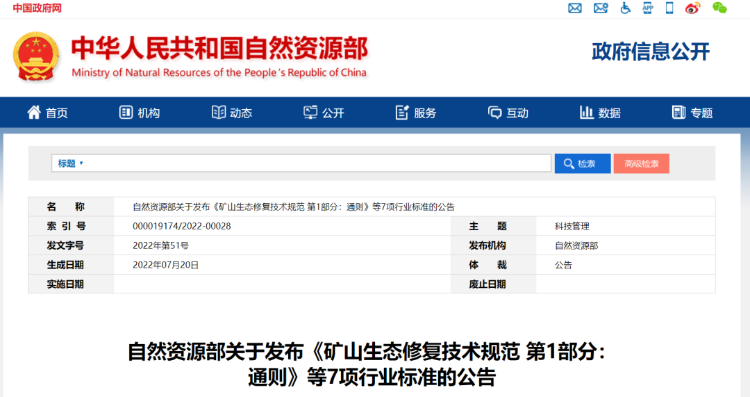 《矿山生态修复技术规范 第1部分:通则》等7项行业标准已通过全国自然资源与国土空间规划标准化技术委员会审查,现予批准、发布,自2022年11月1日起实施。标准编号及名称如下: